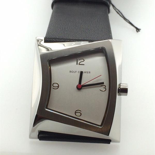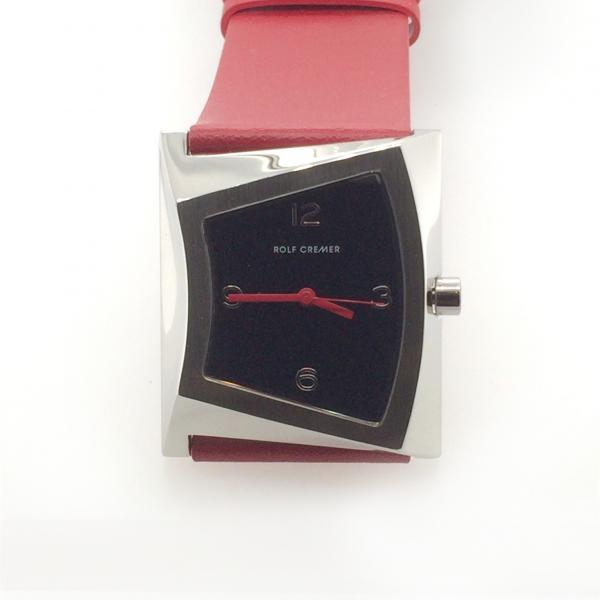 Stahlgehäuse mit Quarzuhrwerk, rotes Lederband, schwarzes Ziffernblatt, rechteckige Form.