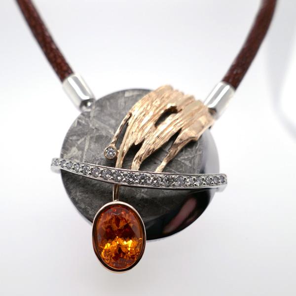 Meteorit mit Mandaringranat, Rotgold, Platin und Brillanten, als Unikat angefertigt.